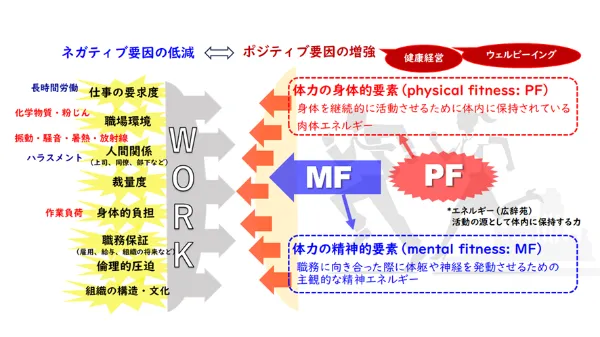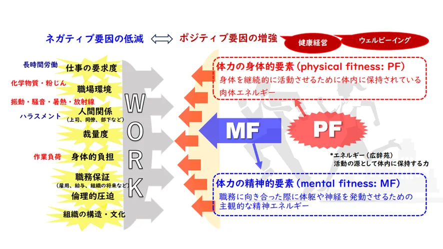 私たちは労働者の「体力」を「身体的体力(physical fitness: PF)」と「精神的体力(mental fitness: MF)」の2つの観点から捉え、ポジティブ要因の増強に資する新たな労働安全衛生の枠組みを構築することを目指しています。